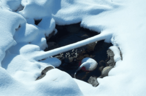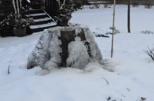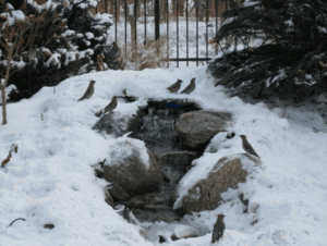 Running water from a waterfall will continue to operate until about minus seven Celsius. Although, one year I went to bed and woke up to minus fourteen and the waterfall was still fine. However, I wouldn’t recommend that. Pumps need to be pulled out and put in the house or garage for the winter. Just as with your irrigation system any water that freezes in the pump can potentially damage it. Water features, for example, bird baths or tiered fountains should be covered with a tarp. It can crack if ice forms, but also the dyes used in the concrete, or especially, in plastic can fade over time. Of course, you will drain your feature as well.
