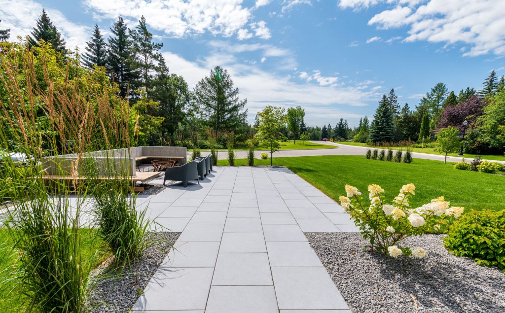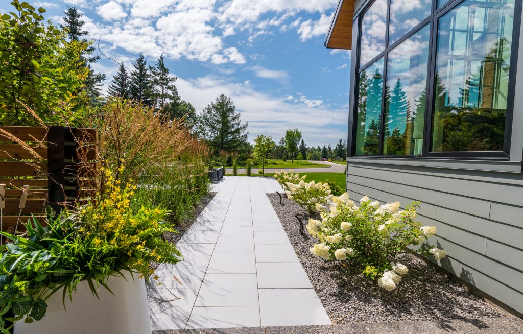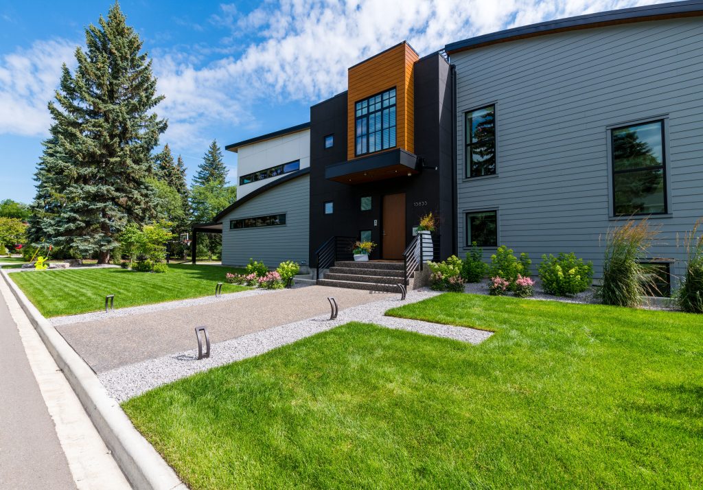 The homeowners were looking for a modern, clean design that would complement the contemporary architecture and long, narrow lines of their home. The family was also looking to incorporate features of their existing landscape they wanted to keep, like the beautiful mature trees. They were also looking for beautiful and practical features like garden lighting in the front and patio areas.