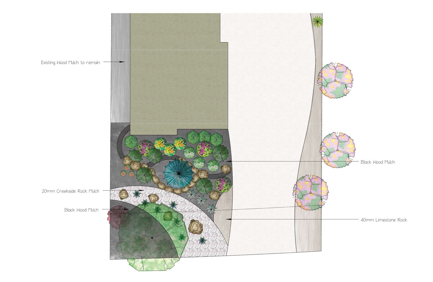- We consider which materials and plants will work best for managing and controlling the flow of water on the property.
