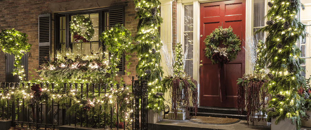 Fairy Lights: For whimsical and lower-effort landscape lights this Christmas, use battery-operated or plug-in fairy lights throughout your outdoor decor. Insert twinkling lights in your wreaths, boughs, and other decorative items. (Note: Freezing temperatures are not kind to battery-operated lights, so you may find yourself replacing batteries more often than normal.)